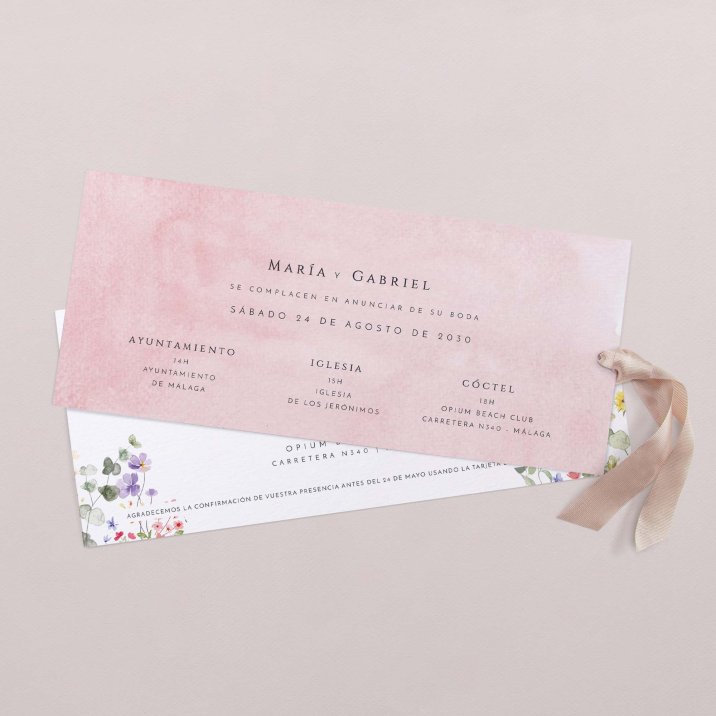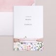 Delicadas flores silvestres llenas de color pintadas en acuarela en la invitación de boda Into the bloom. Una creación poética de estilo primaveral perfecta para anunciar vuestra boda en esa época o incluso en verano.