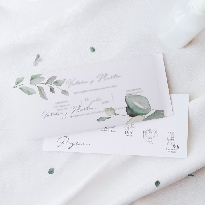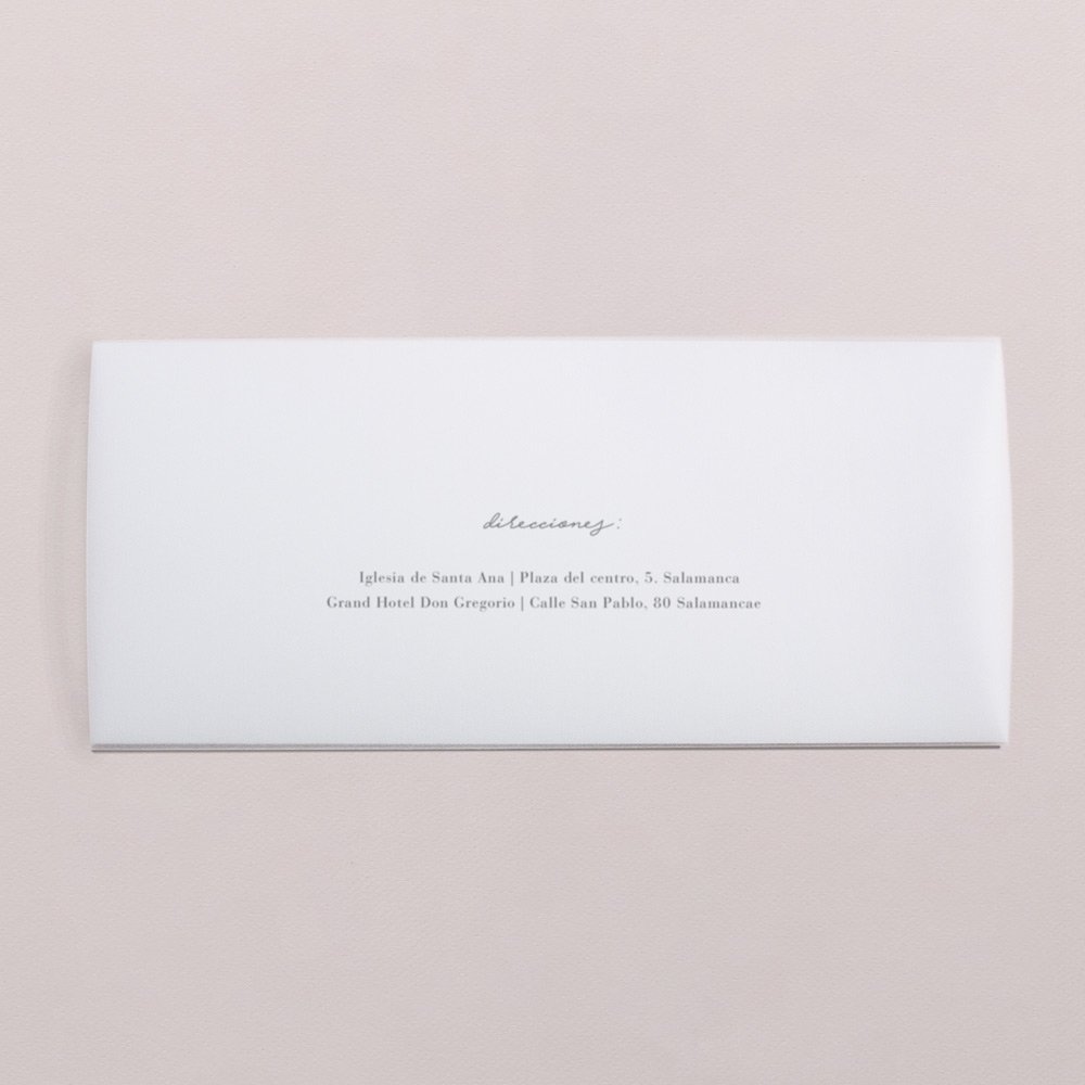 Esta invitación de boda incluye dos tarjetones y un papel vegetal doblado en tres partes para recoger las tarjetas.