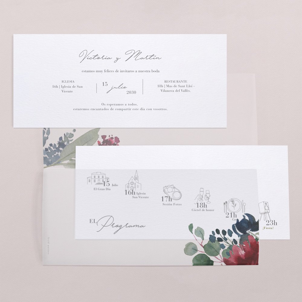 Esta invitación de boda incluye dos tarjetones y un papel vegetal doblado en tres partes para recoger las tarjetas.