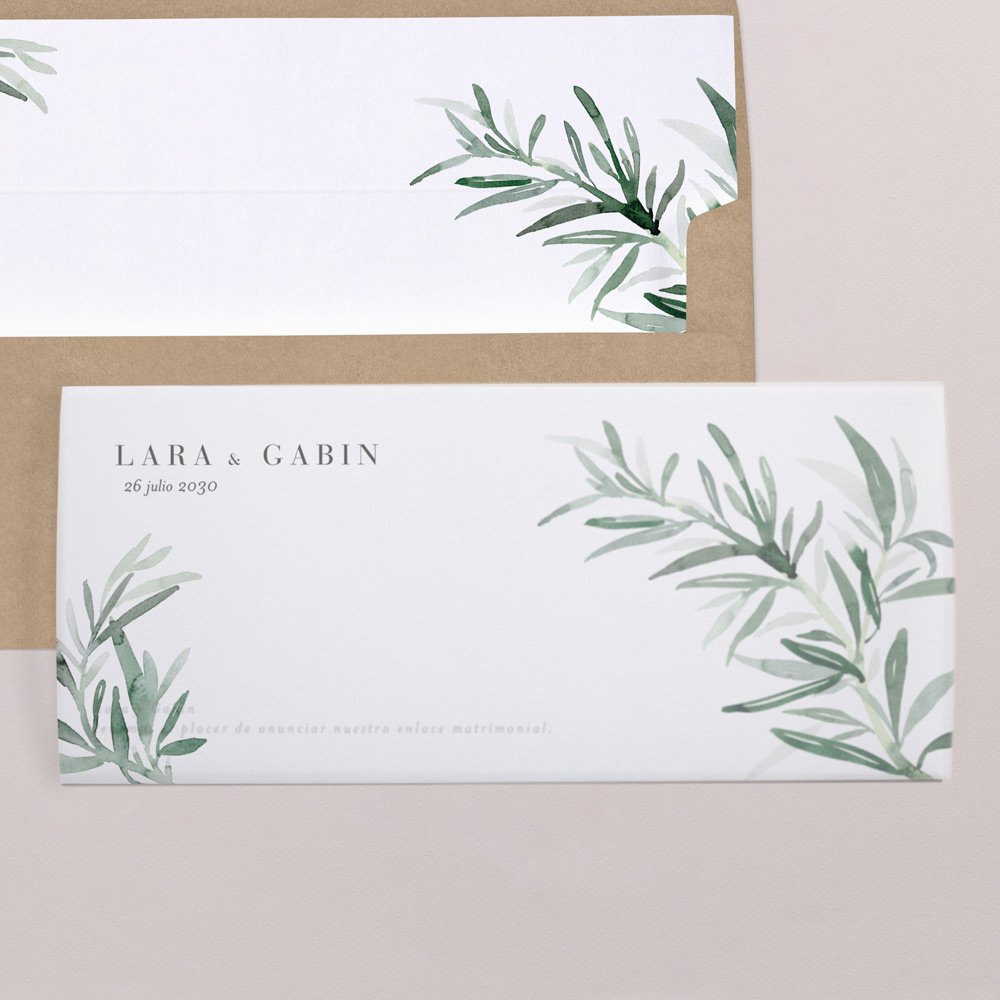 Ilustración vegetal hecha por nuestras diseñadoras, papel vegetal con vuestros nombres y debajo aparecerán los detalles de vuestra boda... Invita a tus amigos y familiares con el modelo Cadaqués.
