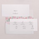 Esta invitación de boda incluye dos tarjetones y un papel vegetal doblado en tres partes para recoger las tarjetas.