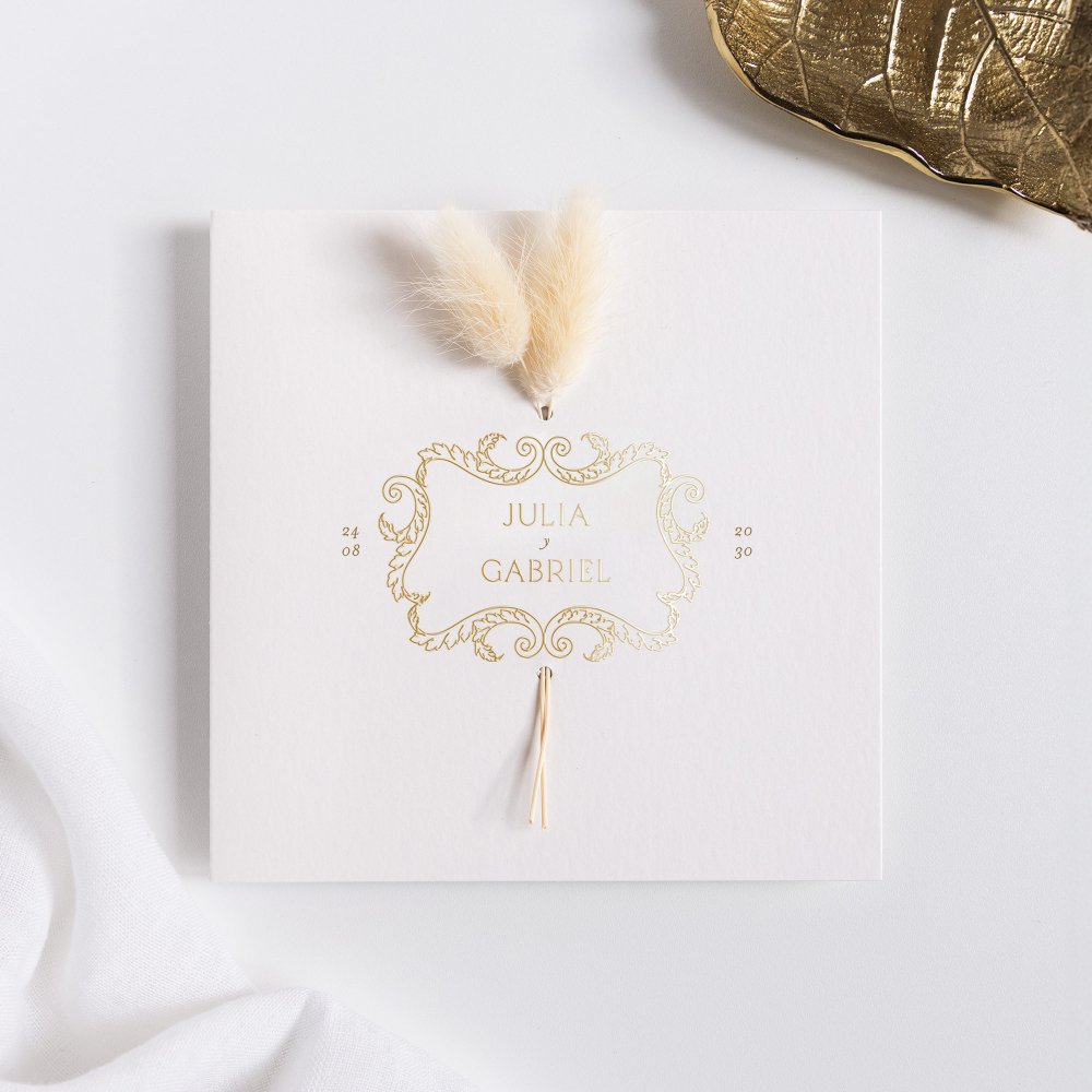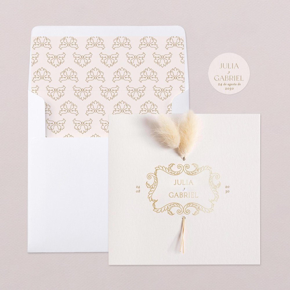 La tipografía y los adornos dorados se realzan con delicados ramitos de flores secas en el anuncio de boda Vittoria. Un diseño minimalista, perfecto para parejas que buscan un modelo que combine elegancia y sencillez.