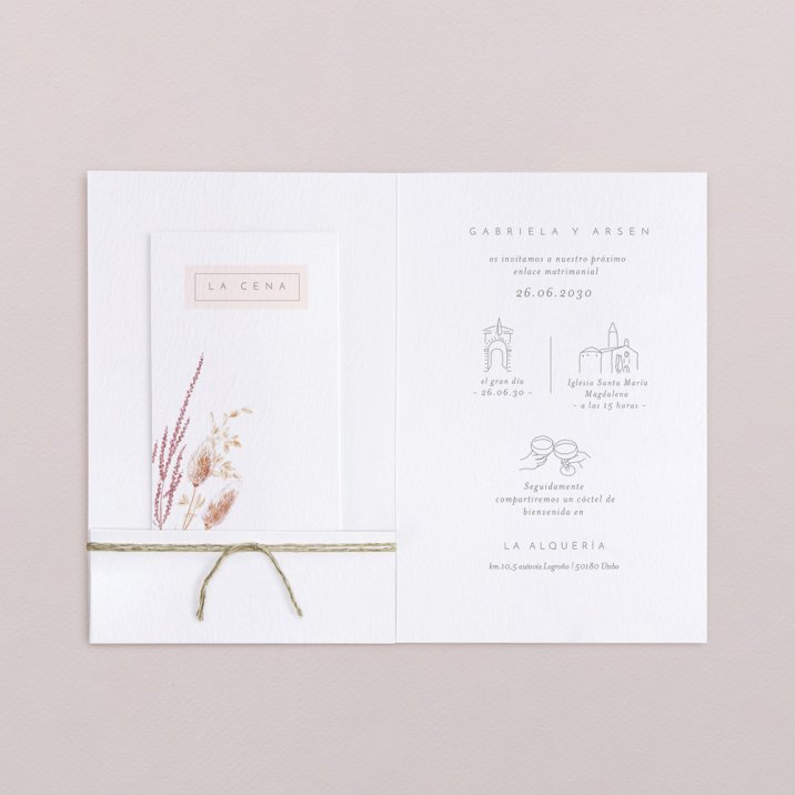 Un ramo de flores secas ilustrado con mucha delicadeza, vuestros nombres en la parte alta y una etiqueta con la fecha de la boda, deal para una boda bohemia y chica, el modelo