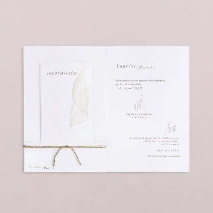Este modelo incluye 2 tarjetas: invitación de boda en formato díptico y una tarjeta para más información.