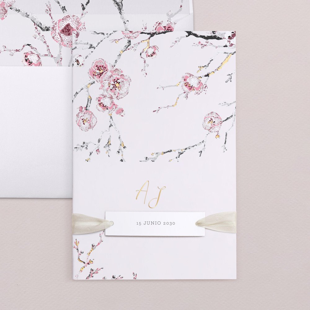 Invitación de boda en papel de alta calidad, de tacto aterciopelado y acabados en oro. En la cubierta vuestros nombres y la fecha resaltarán gracias al acabado oro, así como vuestras iniciales en la etiqueta. Esta invitación se cierra con una faja y se sujeta con una elegante cinta de satén dorado (no incluido en el precio) Imprimiremos vuestro texto en el interior de la invitación.