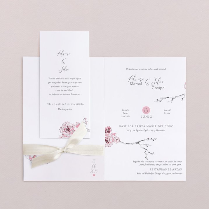 Este modelo incluye 2 tarjetas: invitación de boda en formato díptico y una tarjeta para más información.