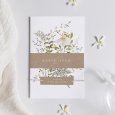 Un ramo de flores silvestres y hierbas ilustrado sobre la invitación Arpèges. Con detalles en fondo color kraft combinados con una tipografía elegante que completan está composición de estilo bucólico. Una invitación ideal para una boda de estilo natural chic.