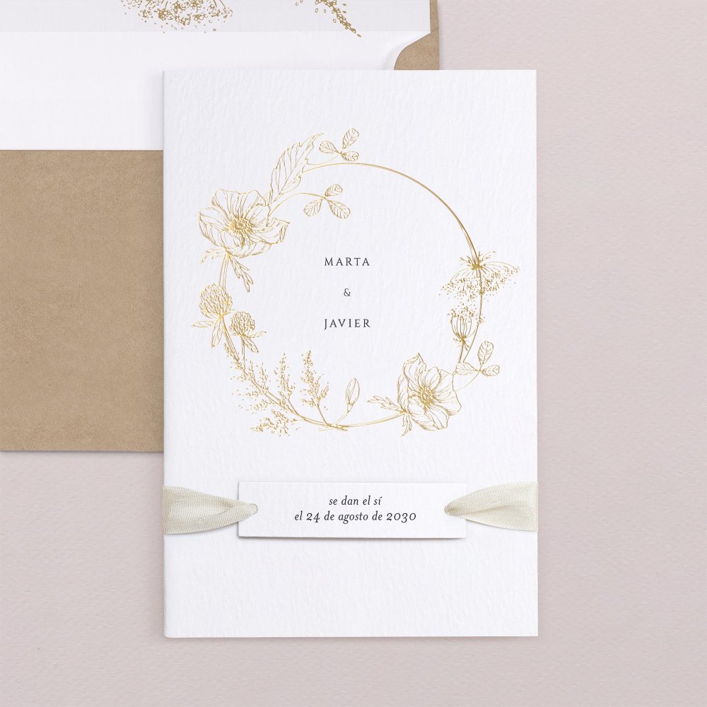 En esta invitación, una magnífica corona de flores en oro enmarca los nombres de los futuros casados. Una composición refinada, perfecta para una boda campestre, chic o bohemia.