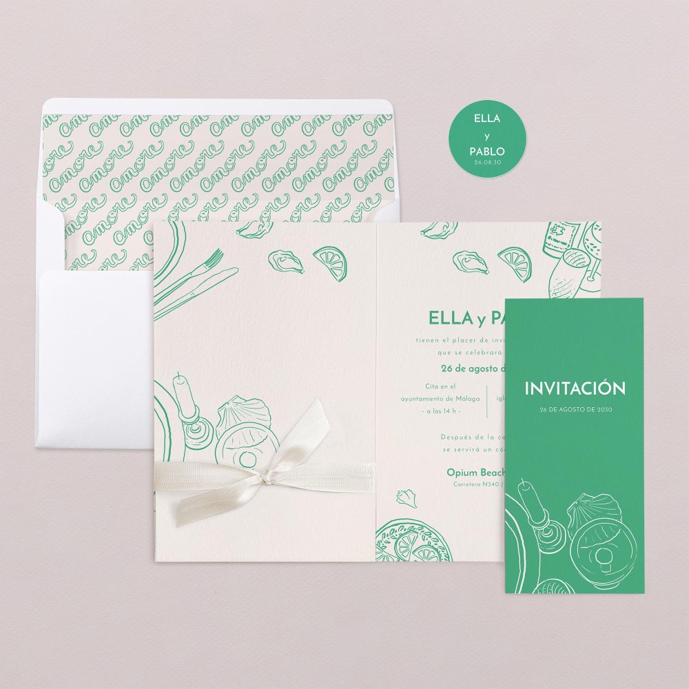 Cítricos, velas y otras decoraciones que realzarán sus mesas están bellamente ilustrados en la invitación de boda Amore Mio. Su amor está inscrito en letras manuscritas en esta creación con suaves tonos mediterráneos, ideal para anunciar una boda de verano.