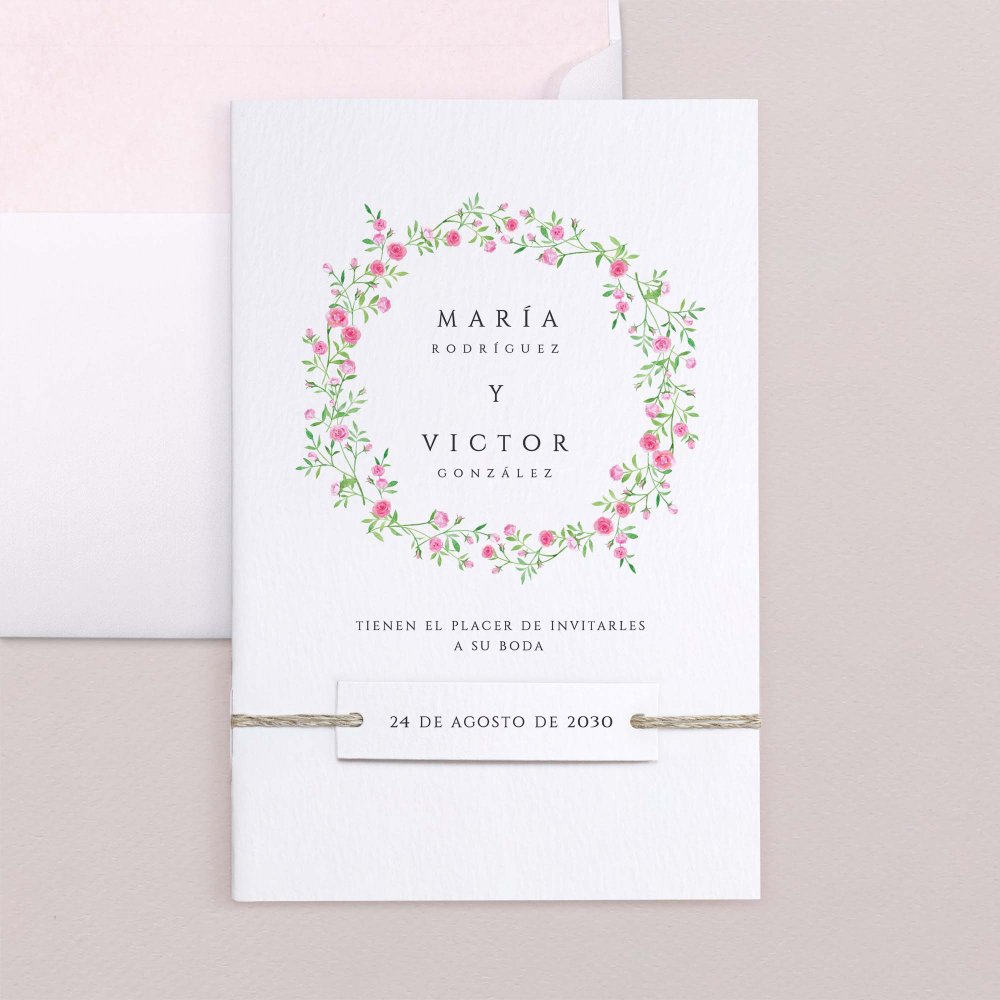 En la invitación de boda Round Romance, una delicada corona de flores rosas en acuarela realza su feliz anuncio. Esta papelería, refinada y romántica, narrará con ternura tu próxima unión.