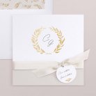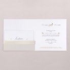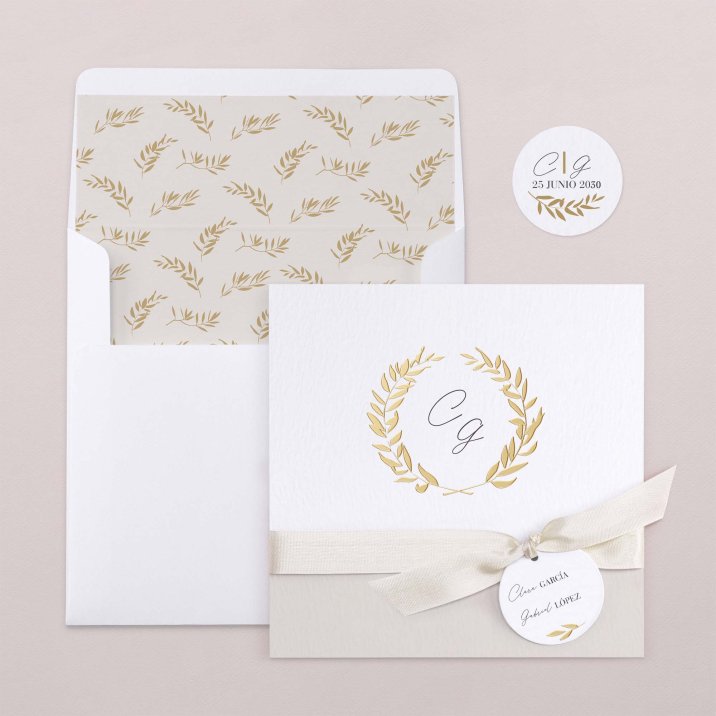 Este modelo incluye la tarjeta de invitación a la boda en formato díptico, una tarjeta para más información que quedará dentro de la invitación y una etiqueta para la fecha. Hay un agujero para incluir el lazo (a elegir y no incluido en el precio).