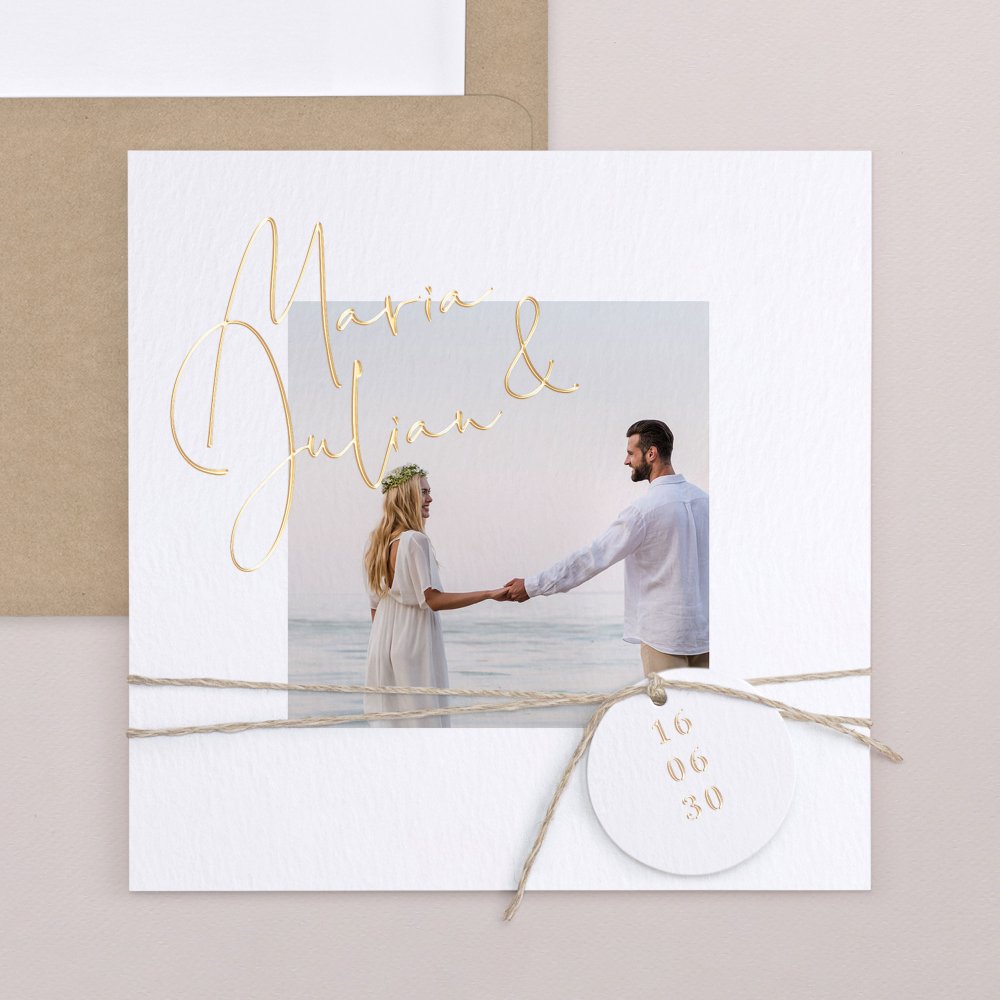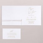 Este modelo incluye la tarjeta de invitación a la boda en formato díptico, una tarjeta para más información que quedará dentro de la invitación y una etiqueta para la fecha. Hay un agujero para incluir el lazo (a elegir y no incluido en el precio).