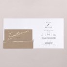 Este modelo incluye la tarjeta de invitación a la boda en formato díptico, una tarjeta para más información que quedará dentro de la invitación y una etiqueta para la fecha. Hay un agujero para incluir el lazo (a elegir y no incluido en el precio).