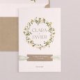 Este modelo incluye la tarjeta de invitación a la boda en formato díptico, una tarjeta para más información que quedará dentro de la invitación y una etiqueta para la fecha. Hay un agujero para incluir el lazo (a elegir y no incluido en el precio).