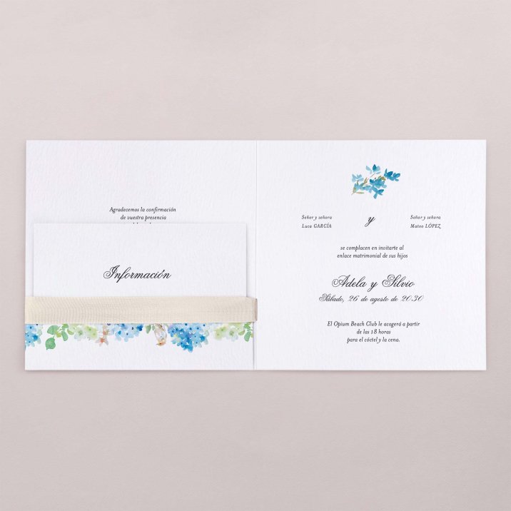 La suavidad de la acuarela cobra vida en la invitación de boda Bird and blue. En ella se esboza un magnífico cuadro de flores y plantas azules, perfecto para contar la poética historia de una celebración campestre y chic.