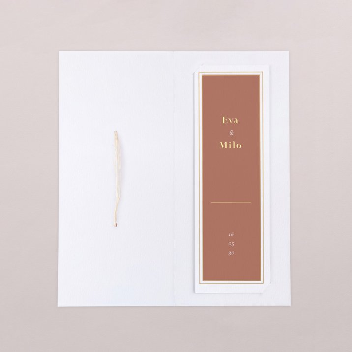 Esta invitación de boda está compuesta por una tarjeta alargada en forma de díptico y un marca páginas en el interior que quedará sujeto por unas hendiduras.
