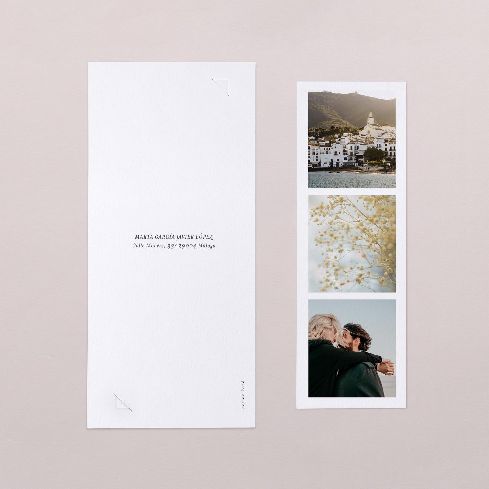Esta invitación de boda está compuesta por una tarjeta alargada en forma de díptico y un marca páginas en el interior que quedará sujeto por unas hendiduras.