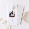 Esta invitación de boda está compuesta por una tarjeta alargada en forma de díptico y un marca páginas en el interior que quedará sujeto por unas hendiduras.