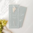 En la invitación de boda Cornwall, delicadas flores y follajes se dibujan sobre un fondo color celadón. Una creación perfecta para anunciar una boda refinada en cualquier estación.