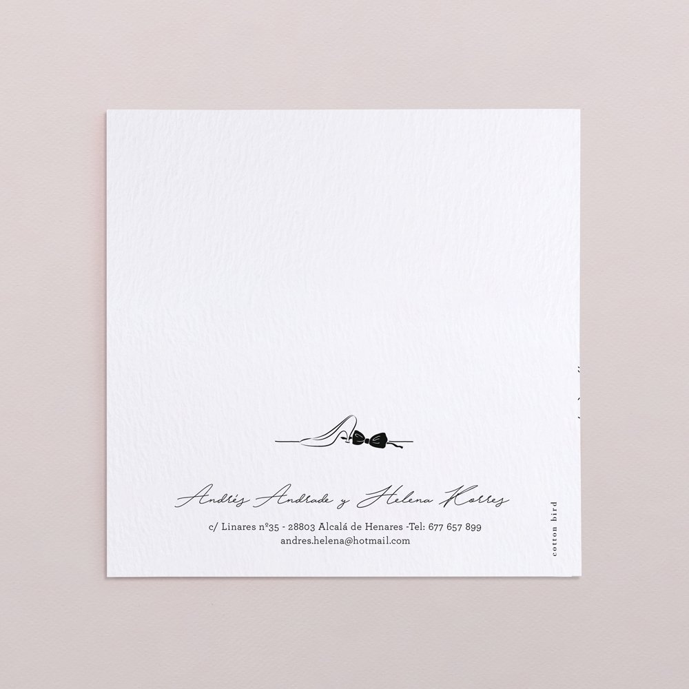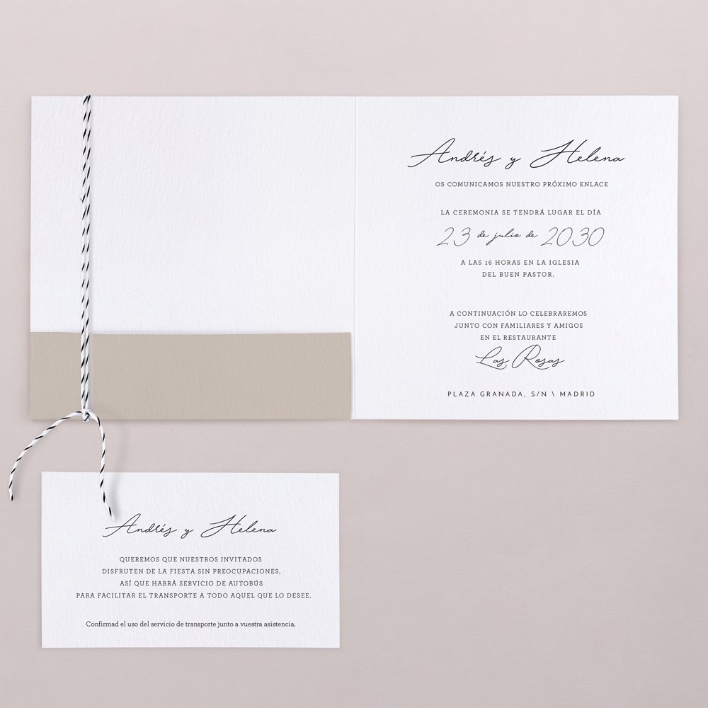 Este modelo incluye la invitación de boda en formato díptico cuadrado, en el interior un pequeño bolsillo donde incluir una segunda tarjeta para más información.