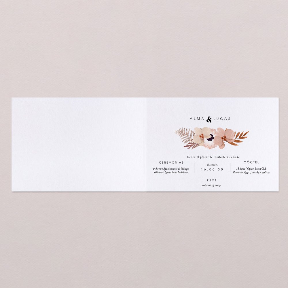 Esta invitación de boda se presenta en forma de tarjeta horizontal rectangular plegada.
