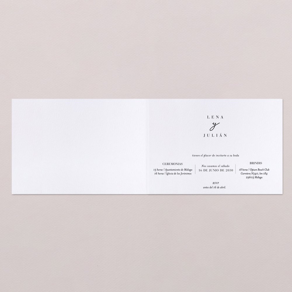 Esta invitación de boda se presenta en forma de tarjeta horizontal rectangular plegada.