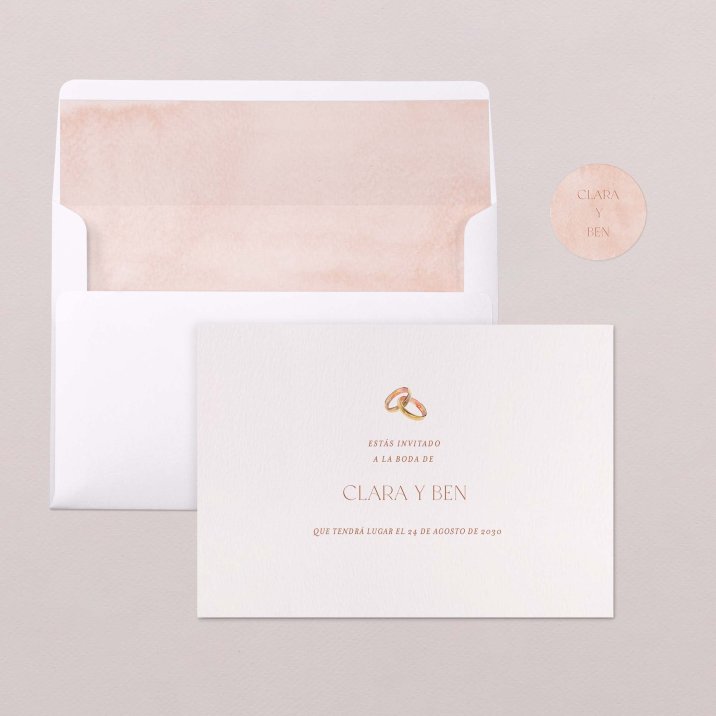 Esta invitación de boda se presenta en forma de tarjeta horizontal rectangular plegada.