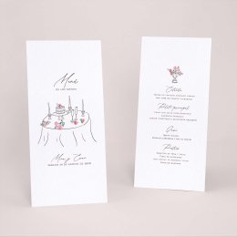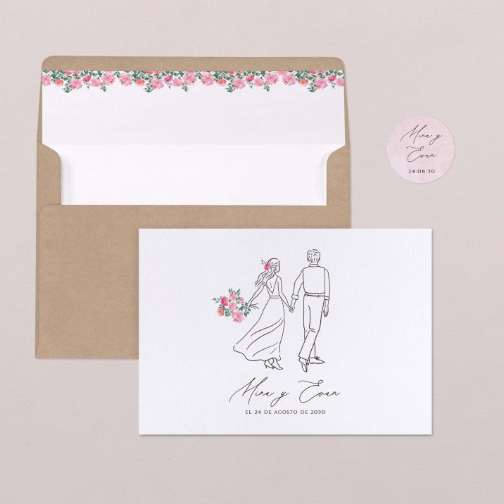 Los novios aparecen dibujados en forma de silueta delicada paseando de la mano en la invitación Ritournelle. Una creación llena de poesía y con unos motivos floridos, perfecta para anunciar bohemia, natural, simple y elegante.
