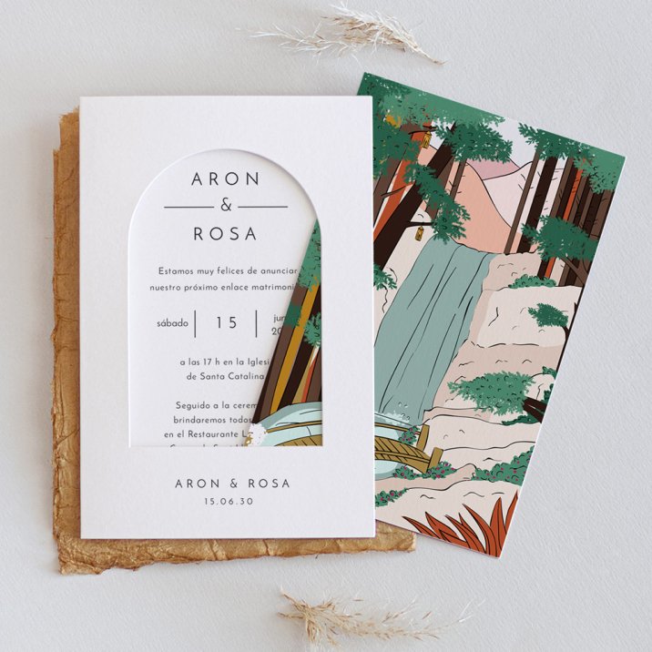 ¿A quién no le encanta una imagen de Bosque encantado? Esta invitación de boda representa una cascada en un bosque, si os casáis en un sitio así será ideal para vuestros invitados y familiares.