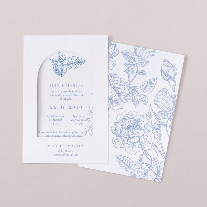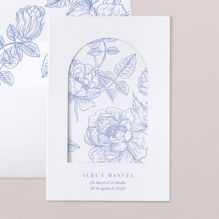 La invitación Mary aúna un estilo floral inglés actualizado y elegantes ventanas para anunciar tu enlace. El bonito recorte en forma de ventana redondeada revela generosas flores monocromáticas: una ilustración ideal para una boda con un encanto retro.