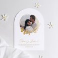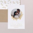 En la invitación de boda La Traviata, una elegante corona vegetal realza tu foto de pareja favorita. En acabado oro, esta composición contemporánea anunciará, de la manera más bonita, vuestra próxima unión.