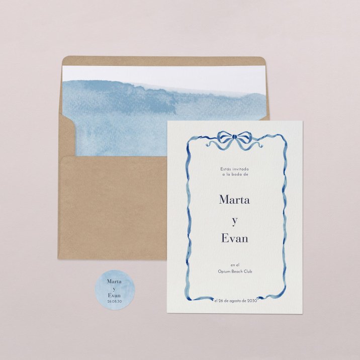 En la invitación de boda Galon Bleu, un delicado lazo en acuarela azul adorna los nombres de los futuros esposos. Una papelería impregnada de una delicada poesía que ya marcará el tono de una unión elegante.