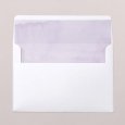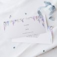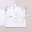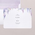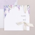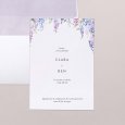 En la invitación de boda Wysteria, unas magníficas glicinias violetas se esbozan en acuarela alrededor de tu feliz anuncio. Una poética composición floral, perfecta para anunciar una boda de verano.