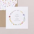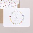 Una corona de flores coloridas decora la invitación de boda Sunny Day. Una creación poética delicadamente acuarelada, que anuncia una celebración llena de luz y alegría.