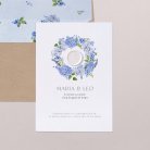 El imprescindible tema floral se reinventa con modernidad en la invitación de boda Hortense. Una hermosa corona de flores en tonos azules se dibuja en esta creación, perfecta para marcar el tono de una boda campestre chic y colorida.