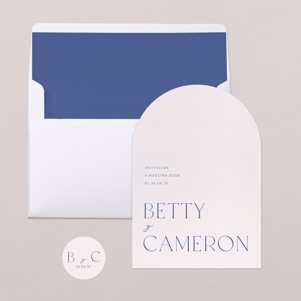 Caracterizada por su borde superior en forma de arco, esta elegante invitación puede personalizarse por ambas caras con los detalles de vuestra ceremonia feliz.