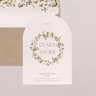 Caracterizada por su borde superior en forma de arco, esta elegante invitación puede personalizarse por ambas caras con los detalles de vuestra ceremonia feliz.