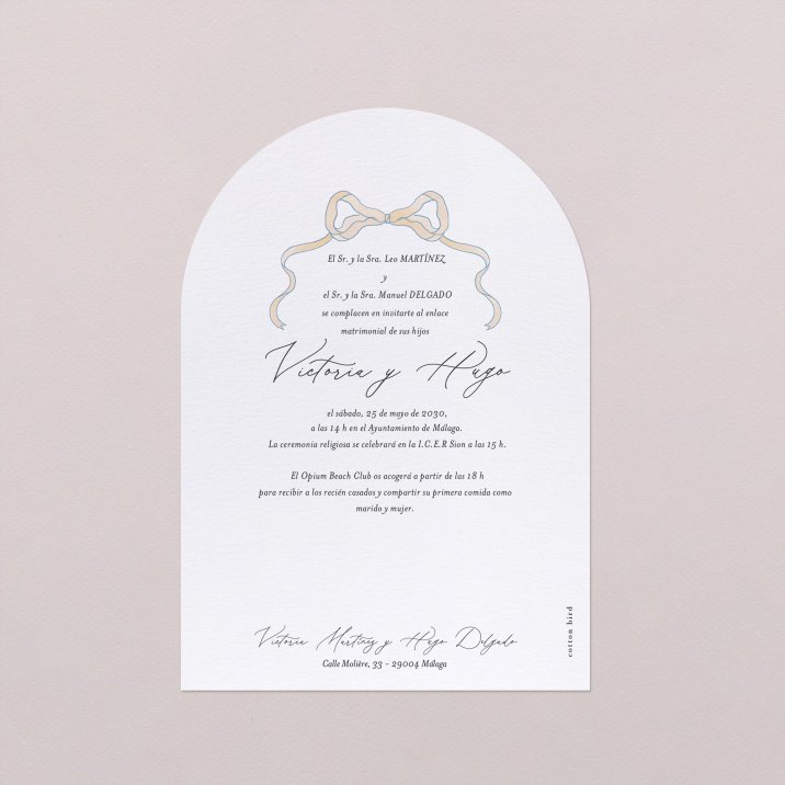 Caracterizada por su borde superior en forma de arco, esta elegante invitación puede personalizarse por ambas caras con los detalles de vuestra ceremonia feliz.
