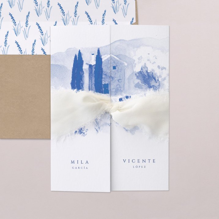 Invitación vertical, con una solapa central y dos solapas laterales móviles. Cuando se abren, revelan los detalles clave de tu gran día. Se pueden cerrar con un bonito lazo (en suplemento).