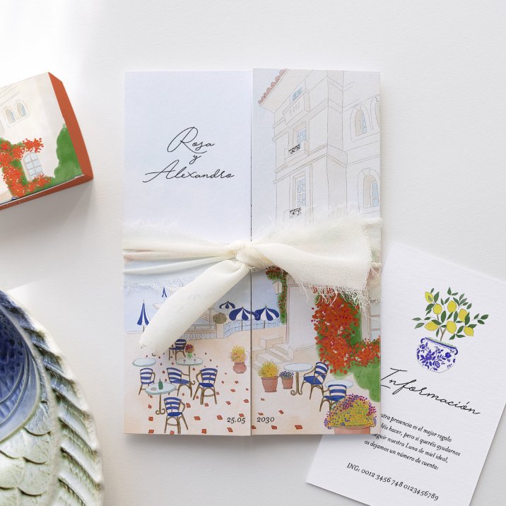 Invitación vertical, con una solapa central y dos solapas laterales móviles. Cuando se abren, revelan los detalles clave de tu gran día. Se pueden cerrar con un bonito lazo (en suplemento).