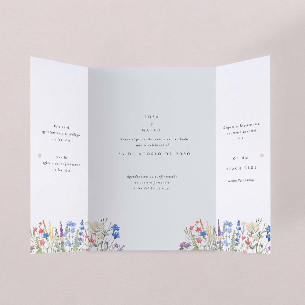 Invitación vertical, con una solapa central y dos solapas laterales móviles. Cuando se abren, revelan los detalles clave de tu gran día. Se pueden cerrar con un bonito lazo (en suplemento).