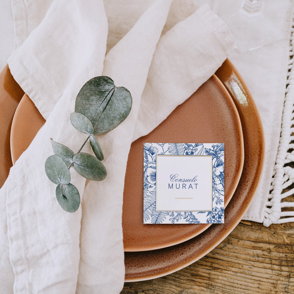 Para que tus invitados encuentren su sitio, nuestros carnets de mesa se pueden poner en las mesas del banquete. Van decorados por los dos lados.