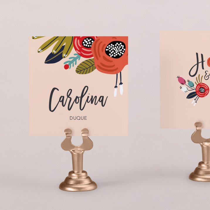 Para que tus invitados encuentren su sitio, nuestros carnets de mesa se pueden poner en las mesas del banquete. Van decorados por los dos lados.