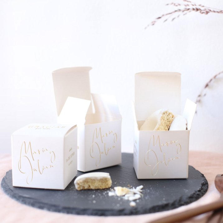 Esta cajita (de 5,4 x 5,4 cm) se puede rellenar con dulces, peladillas u otras sorpresas. Será un original regalo que podréis colocar sobre las mesas y regalar a vuestros invitados como recuerdo de vuestro maravilloso día.