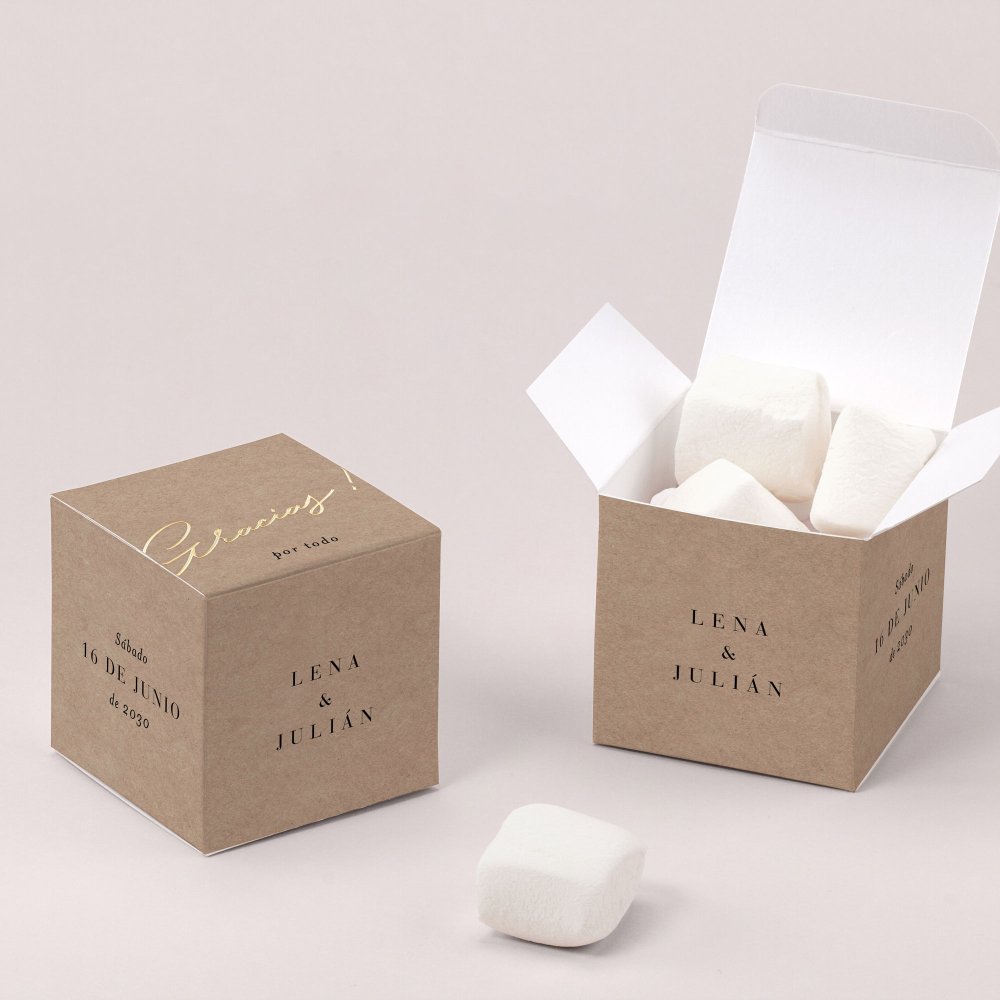 Esta cajita (de 5,4 x 5,4 cm) se puede rellenar con dulces, peladillas u otras sorpresas. Será un original regalo que podréis colocar sobre las mesas y regalar a vuestros invitados como recuerdo de vuestro maravilloso día.