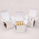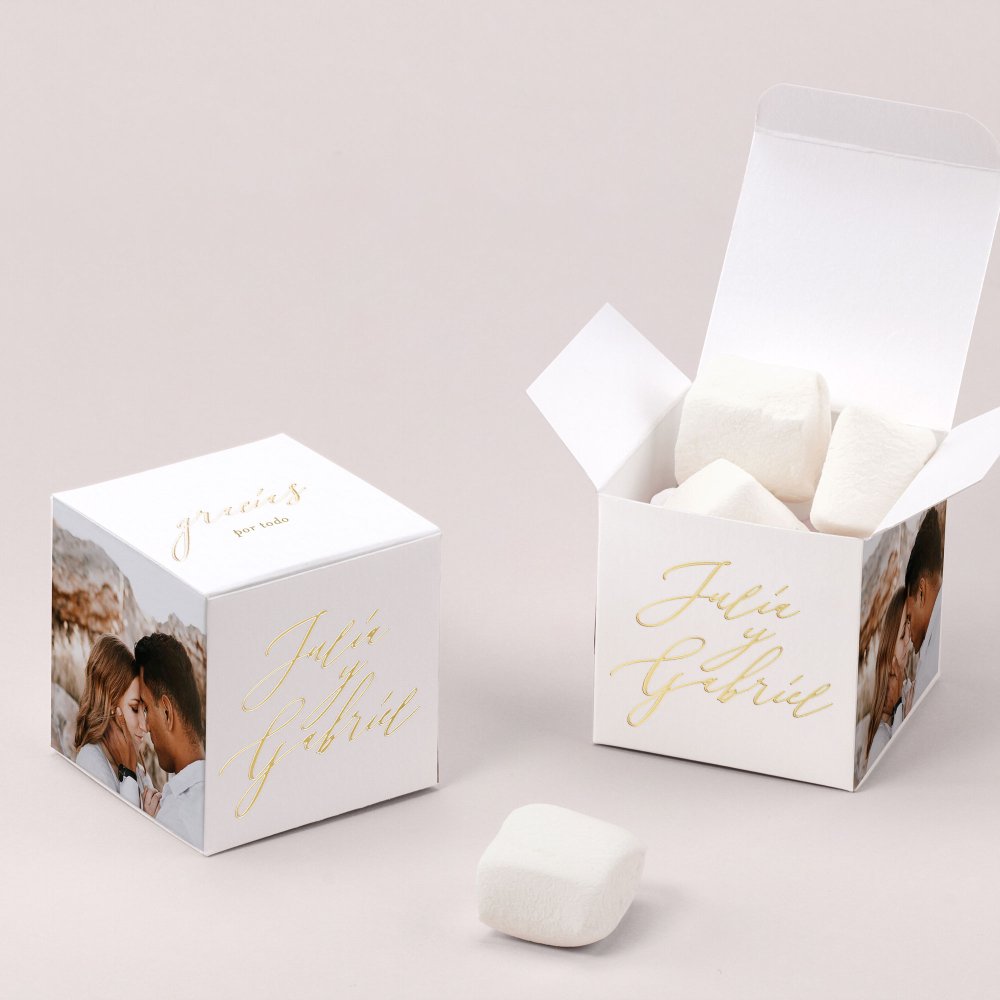 Esta cajita (de 5,4 x 5,4 cm) se puede rellenar con dulces, peladillas u otras sorpresas. Será un original regalo que podréis colocar sobre las mesas y regalar a vuestros invitados como recuerdo de vuestro maravilloso día.