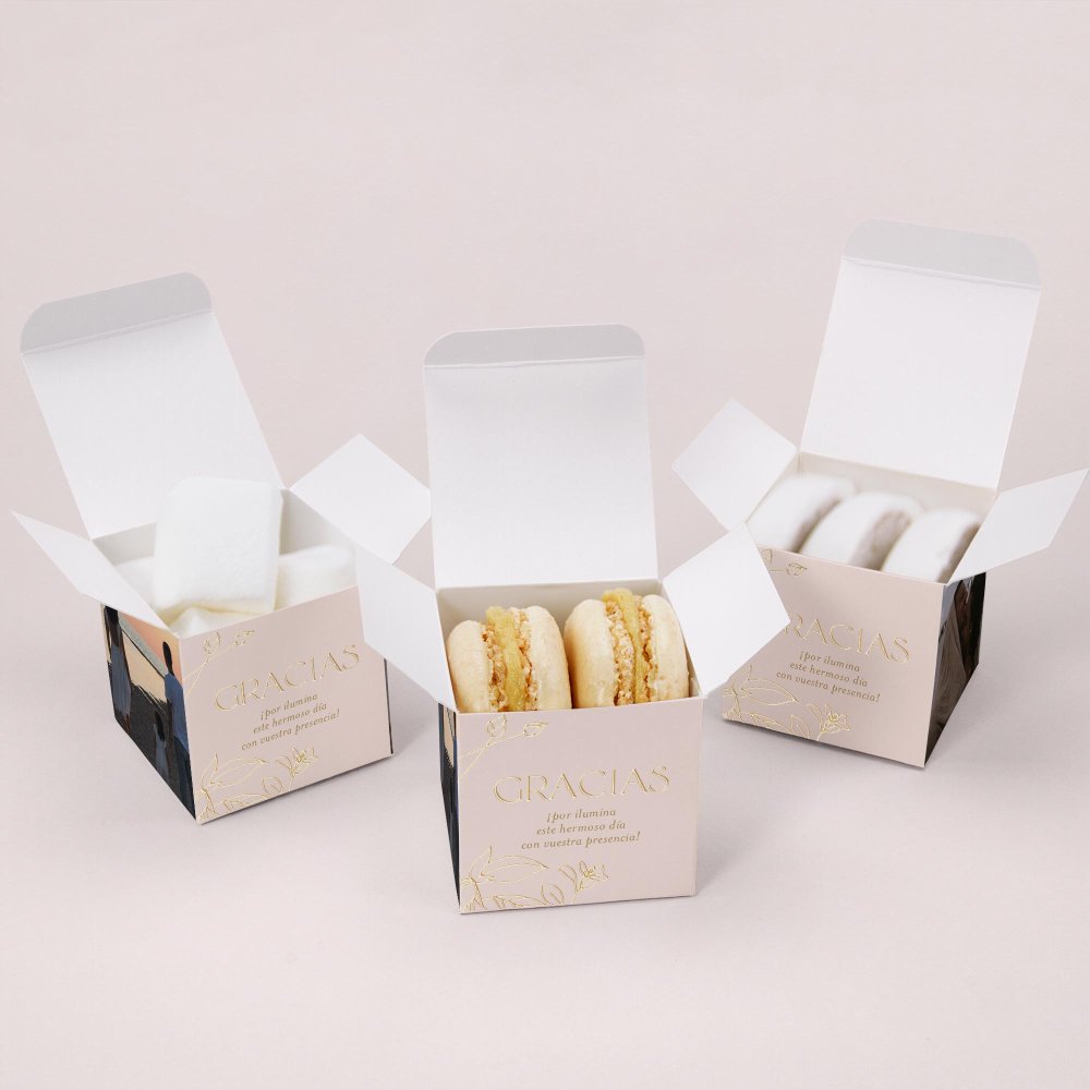 Como sugerencia podéis rellenarlas con nuestras peladillas elaboradas artesanalmente en el sur de Francia (propuestas como accesorio por separado). Os aconsejamos llenarlas con 20 peladillas por caja (50 g). Atención, las cajas vienen listas para montar.