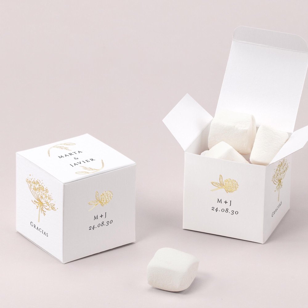 Esta cajita (de 5,4 x 5,4 cm) se puede rellenar con dulces, peladillas u otras sorpresas. Será un original regalo que podréis colocar sobre las mesas y regalar a vuestros invitados como recuerdo de vuestro maravilloso día.