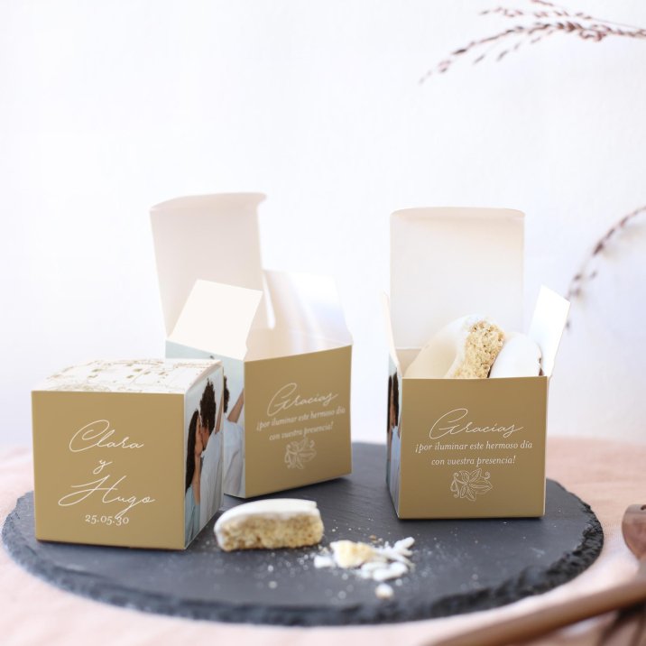 Esta cajita (de 5,4 x 5,4 cm) se puede rellenar con dulces, peladillas u otras sorpresas. Será un original regalo que podréis colocar sobre las mesas y regalar a vuestros invitados como recuerdo de vuestro maravilloso día.