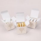 Esta cajita (de 5,4 x 5,4 cm) se puede rellenar con dulces, peladillas u otras sorpresas. Será un original regalo que podréis colocar sobre las mesas y regalar a vuestros invitados como recuerdo de vuestro maravilloso día.